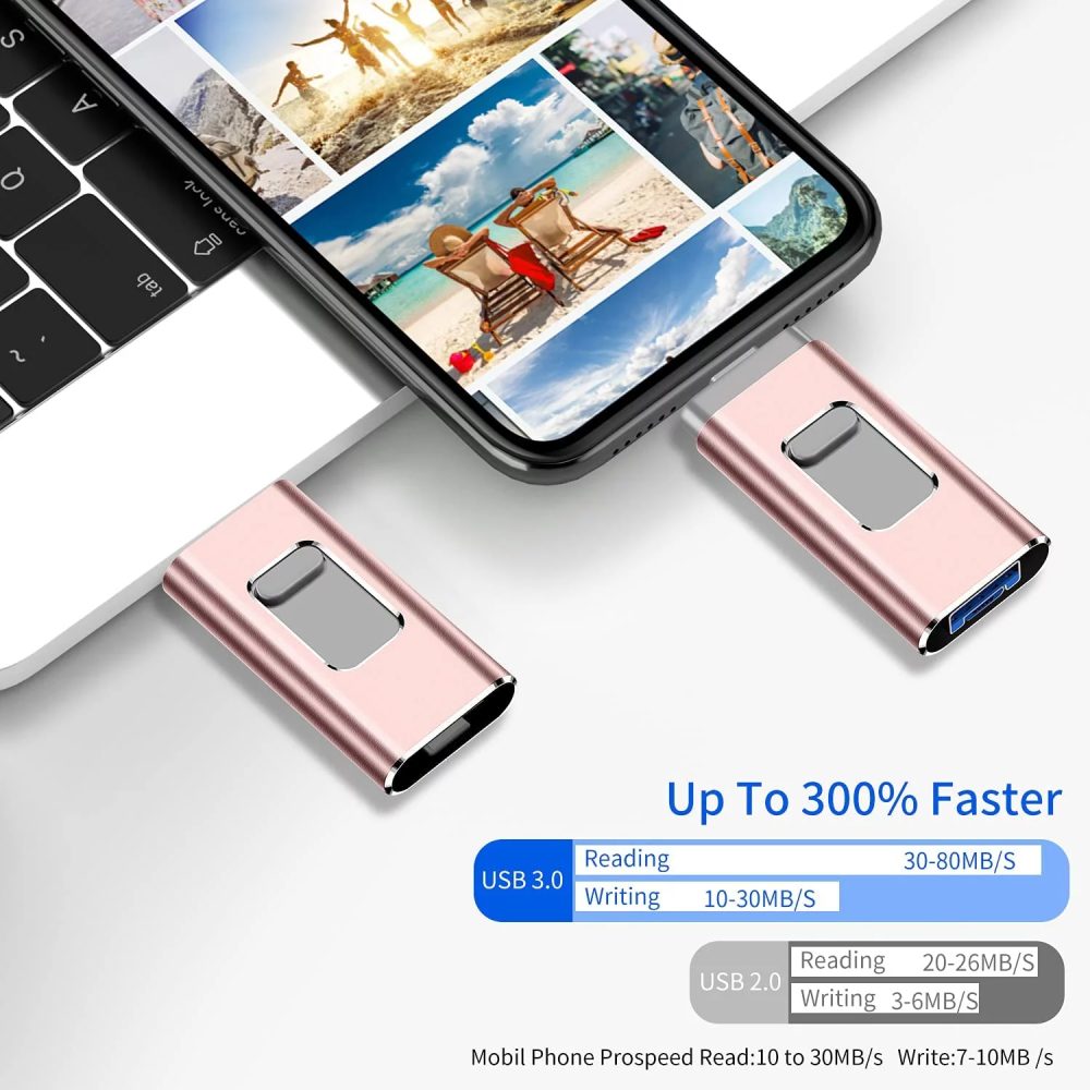 ?ãMulti-Interface DesignãThe memory stick with iPhone port/usb3.0/micro usb/type c (independent adapter) compatible with iPhone//Computer and other devices with usb ports, can transfer data between various devices, easily complete data sharing.