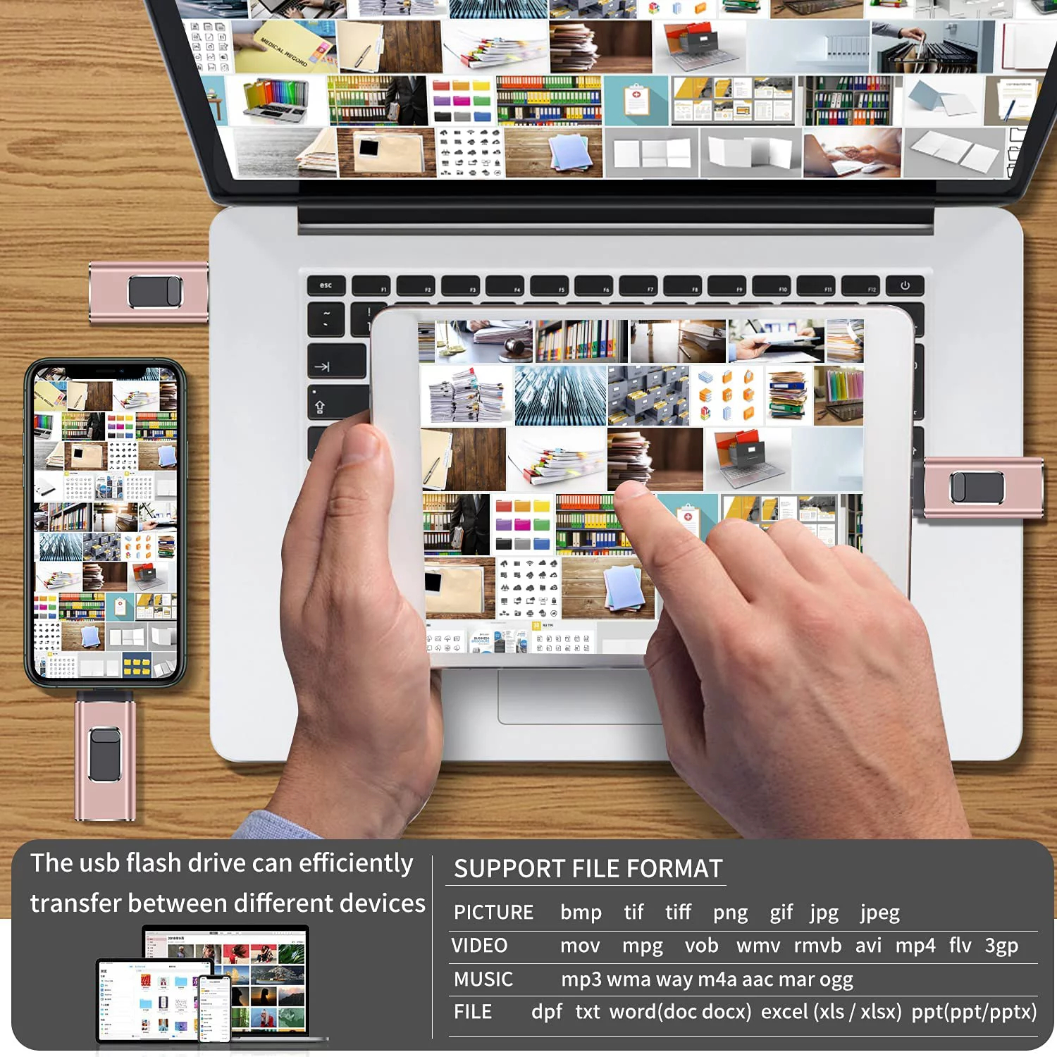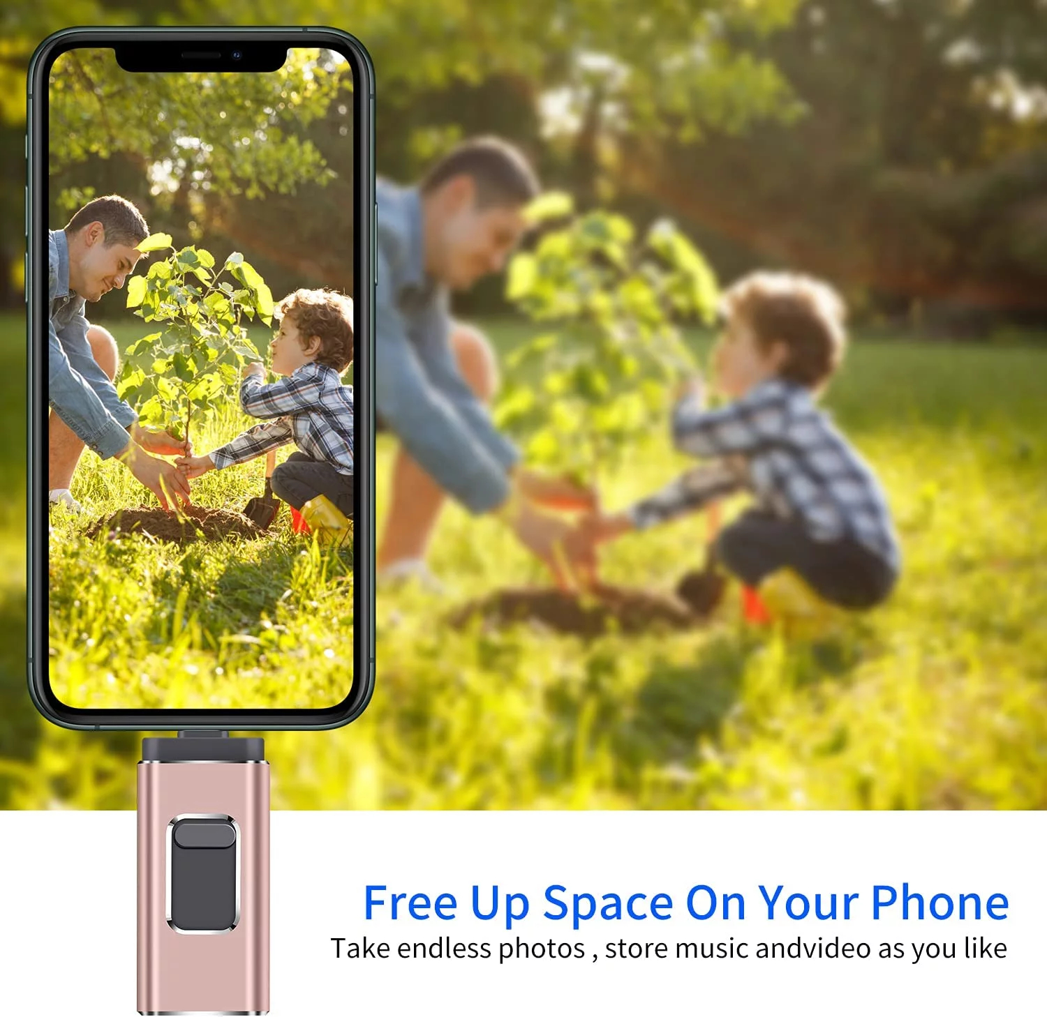 ?ãOne-Click BackupãThe memory stick plug and play, you can back up multiple files such as videos/pictures/documents with one click,No more cumbersome paste copying,Save you more time.When the photo stick is plugged into the iPhone//Computer etc, you can directly store the video and photos you have taken on the flash drives without occupying the device memory.